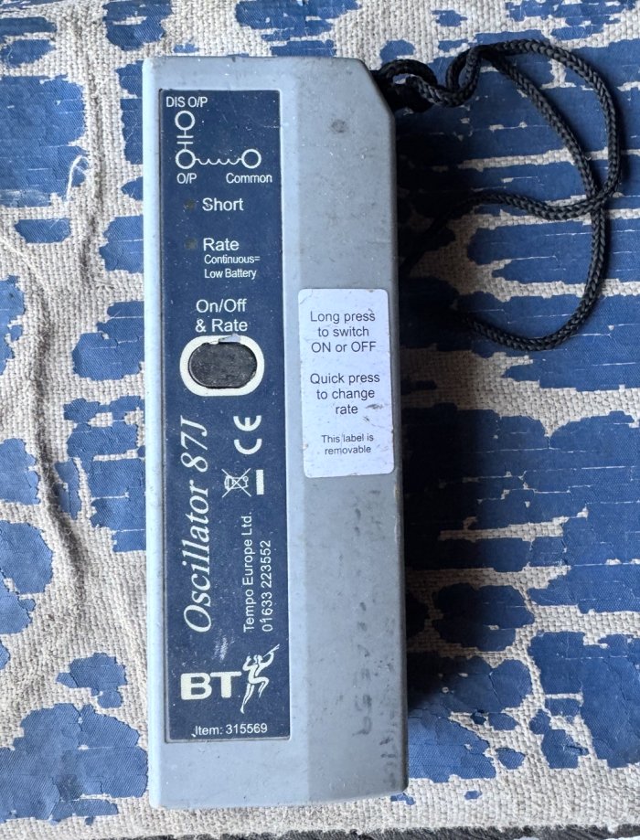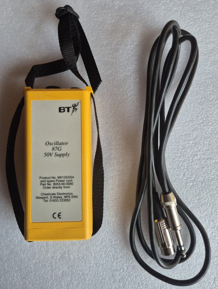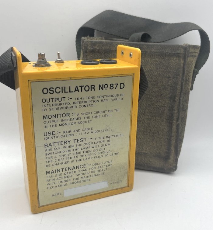 housed in a metal case and is normally carried in a Satchel No. 3B. The Oscillator is operated from a 4.5v supply "Battery Dry No. 23" and provides a 1 kHz tone source of 10mW into 300 ohms and has been designed for use with Amplifier No. 109 for Cable pair identification. Output frequency: 1Kc/s continuous, or interrupted 2-20 p.p.s. at 15mW. Used for cable and cable pair identification. Part of Tester No. 132. To be requisitioned separately as required:- 1 x Battery, Dry No. 23. 1 x Cord, Test No. 2/72AT. 1 x Plug No. 420 with Cord, Instrument 2/138AB 54". 1 x Receiver Headgear No. 16T. 1 x Satchel No. 3A. Drawings - 91140, 91276, 91668 and 61688. Circuit Diagram - SA9132. Specification - D2112.