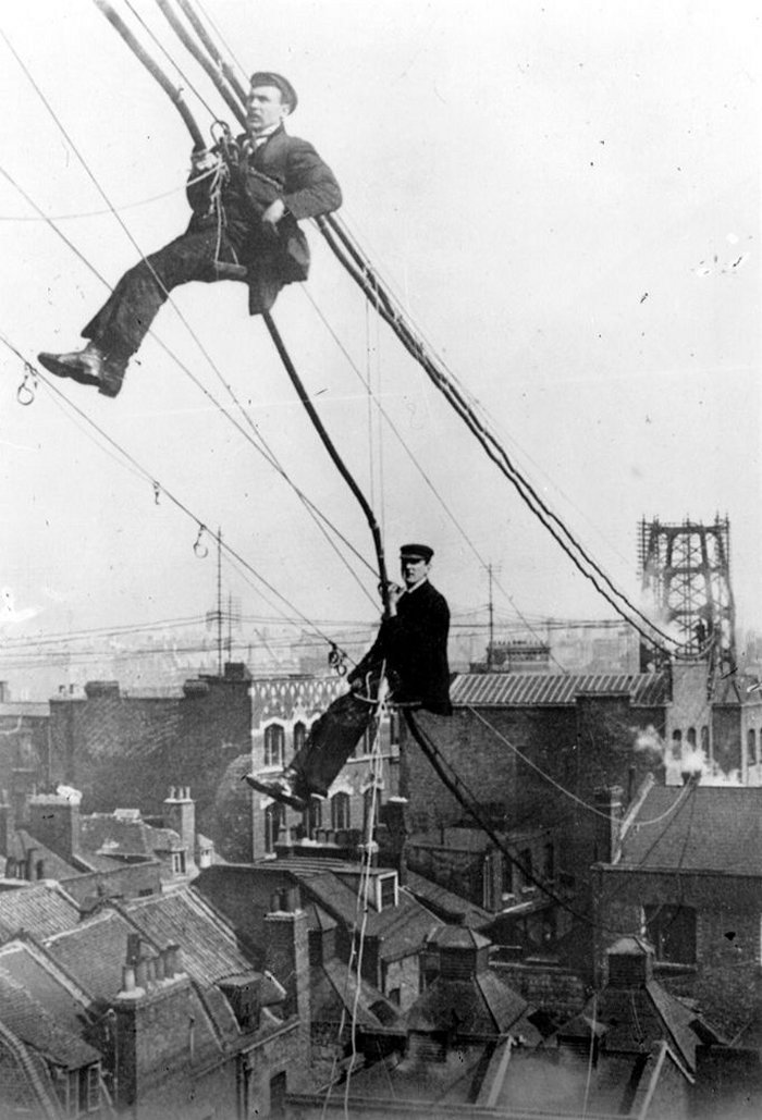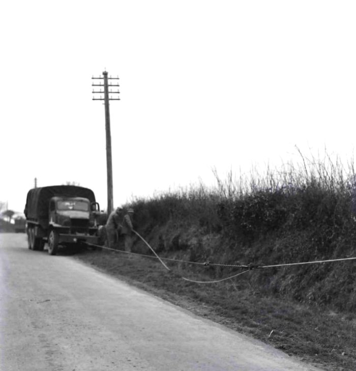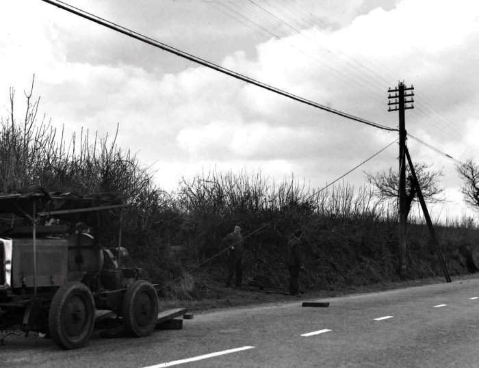 Click here for Overhead Construction Menu Multicore underground cable was introduced early on in Telecommunications but aerial cable was not used that much. This was probably due to the cost of producing small quantities and the technology involved in hanging such a cable. The obvious way to hang a cable in those days was the catenary wire, where a steel wire is suspended, between two points and a cable attached to it. The GPO used this idea and attached the cable by various forms including the use of a lashing machine which wrapped a wire around both the catenary wire and the multicore cable, as a continuous support. In the 1950's the catenary wire became integral to the multicore cable and self suspended aerial cable was thus formed. Erection of aerial cable was more difficult than small gauge open wires and specialist equipment was designed to assist. This cable was generally used in rural areas where undergrounding cables was expensive or impossible. Aerial cable erection at Haverford West (1944)