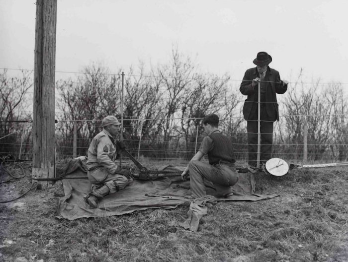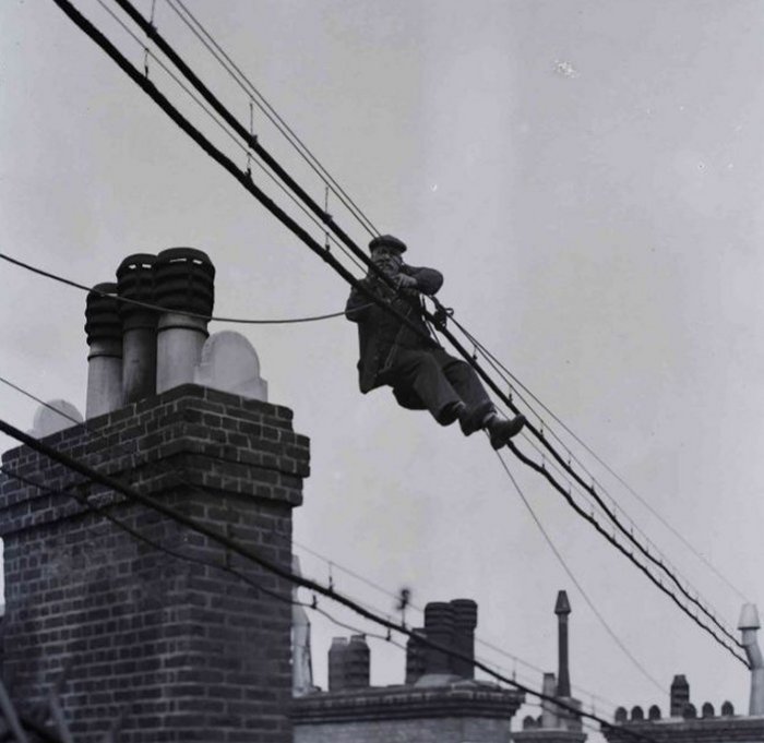Erecting aerial cable using a Cable Lashing machine (1954)