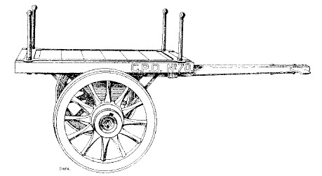 FIG. 1 - POLE CART 5. Pole Cart 6. Pole Sliding Boards facilitate the erection of poles in 'stepped' holes. They act as a guide and provide a smooth surface down which the butt of the pole slides without displacing soil, ,etc., into the bottom of the hole. 7. The boards, which should be obtained locally, should be made from best-quality pitch pine, free from shakes or other defects, and painted with one coat of wood priming and two coats of lead colour ; well-seasoned elm or ash may be used if pitch pine is not readily available. For poling generally, plain boards, 7 ft. x 10¾in. x 1½in., will suffice. For protection, the ends of these plain boards should be bound with hoop-iron. For the erection of long or heavy poles, the boards may be reinforced by strips of 1½in. dia., half-round wrought iron, placed lengthways on the front of the boards at 6½in. centres, and secured by 1½in. No. 14 countersunk screws at 8in. intervals. Four cross-pieces of wrought iron, 2in. x 3/8in. x 10¾in., should be secured by means of 1½in. No. 14 screws to the back of the board, two being placed at the extreme ends and two at 1 ft. from the ends. Hand-holes, 2in. x 5in., may be cut 3½in. from each end. 8. Pole Lifters (Fig. 2), for use in the erection of poles in cylindrical holes and in the earlier stages of the erection of heavier poles, are made in four lengths, viz :-10, 12, 14 and 16 ft. If preferred, stout ladders of suitable lengths may be used instead of the lifters, the latter being entirely dispensed with. When a heavy pole is being raised, pole lifters should be used only in conjunction with ladders; the lifters should not be relied upon to take the weight of the pole.