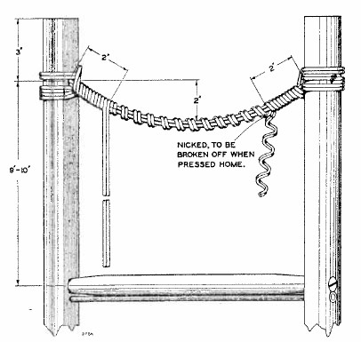 FIG 3 - WIRE RUNG ON LADDER 11. Four 7ft. lengths of "Wire, Galvd., Line, 400lb." are passed through the holes so that equal lengths project from either side of the ladder. Between the stiles, the wires are bent so as to provide a dip of 2in. in the middle of the rung. The free ends at each side are then wrapped tightly, in pairs, round the stiles - one pair 11 turns in one direction, and the other pair 11 turns in the opposite direction. The two pairs at the inner side of one stile are brought together and wrapped closely and tightly, side by side, round the four centre wires to within 2in. of the other stile. The pair nearer this stile is then cut off and the ends pressed home, and the other pair unwrapped to within 2in. of the first stile and cut off. The two pairs at the opposite stile are then similarly wrapped in the remaining gaps, to meet the pairs first dealt with. Finally, the wires are cut and the ends pressed home so as to leave no gaps or sharp edges. 12. Pole Jacks