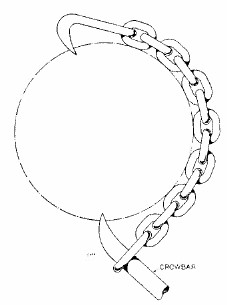 FIG. 4 - POLE TWISTER (1960) 16. "Crowbars, No. 1" are used during erection to guide the foot of the pole and, upon erection, when it is necessary to trim the hole or twist the pole to get it into the required position. 17. "Shovels, Gravel, No. 3" or "Spades, Trench", "Punners, Wood" (or "Punners, Iron" as preferred) and "Brooms, Bass" are the appropriate tools for filling-in. Digging bars - see para. 18 - are used instead of punners in cylindrical holes. 18. "Bars, Digging" 7ft. long, have one chisel end, and one punner end. They are used in cylindrical holes to act as a slide for the butt of the pole during erection and to consolidate the soil when filling-in, see paras. 23 and 50.