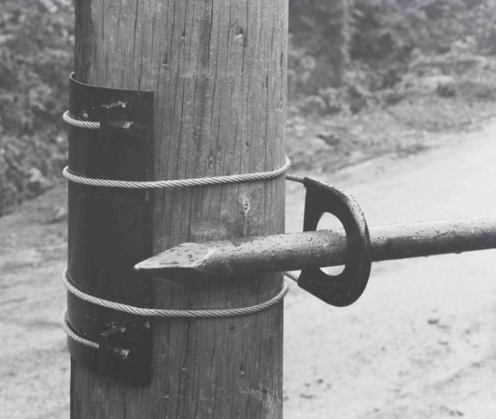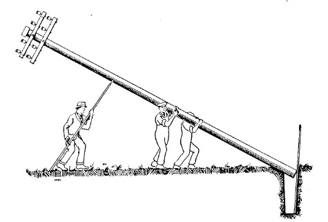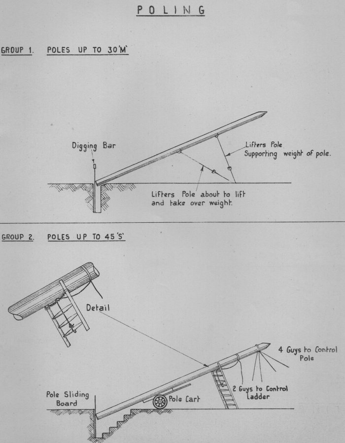 Click here for Overhead Construction Menu Click here for a Pole Erection Party in action using Lifters and Ladders P.O. ENGINEERING DEPT POLING 1. General 2. No rigid rule can, however, be laid down as to the sizes which should be erected by one method or by another. The position in which the pole is to be erected should have consideration in determining the method to be used. For instance, on replacement work where the existing pole is suitable for use as a derrick, a saving in labour can sometimes be made by using the derrick method for a pole which would otherwise be raised by means of ladders. 3. Equipment 4. Care should be taken to ensure that all equipment used in pole erection is in a sound condition, and of adequate strength for the work in hand. Particulars of safe working loads for various sizes of rope are given in TOOLS AND TRANSPORT, Mechanical Aids, B1002, and details of the mechanical advantage obtained by various arrangements of blocks and tackle and the stress on the different parts, in TOOLS AND TRANSPORT, Mechanical Aids, B1005. The weights of wood poles are given in C1101 and on Card TE706.