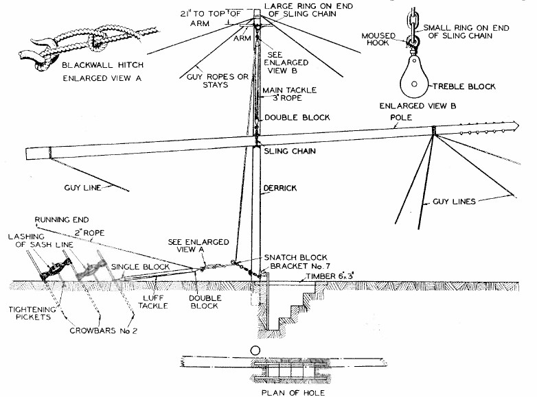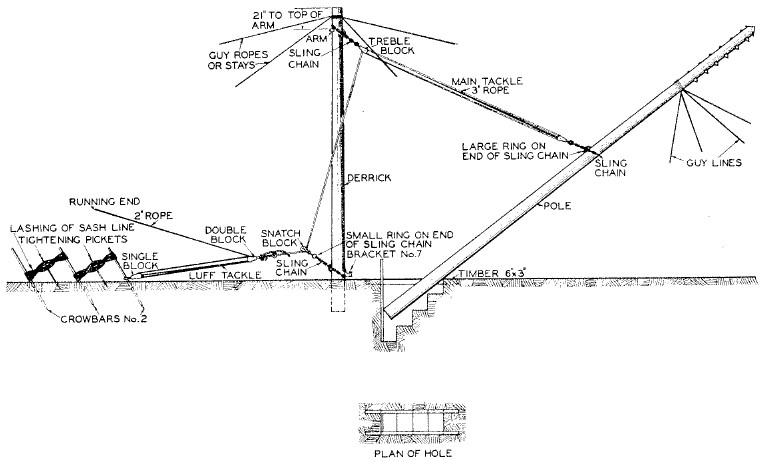 33. "Middling" method 34. The double block should be attached to the main pole by means of a sling chain, so fitted that when raised from the ground the pole will be slightly "butt heavy." Three or four guy lines should be attached to the main pole for the purpose of steadying it during the course of erection. A guy line, attached about 3ft. from the foot of the pole, will be found useful for controlling the butt while the pole is being raised. The pole should be raised gradually until the point of balance is sufficiently high to enable the pole to be swung into a vertical position, with the butt just clear of the ground. The pole sliding board should be placed vertically at the deep end of the hole, the butt guided into position over the hole, and the tackle run out to allow the pole to drop into place. 35. For specially-heavy poles, the running end from the main tackle should be brought down the derrick to a 1in. snatch block attached to the derrick near the ground line by means of a sling chain. The chain should be prevented from slipping upwards by a pole bracket ("Bracket, No. 7"), or a pole step inverted and secured to the pole by means of coach screws. After being passed through the snatch block, the main tackle rope should be attached by means of a "Single or Double Blackwall" hitch (see TOOLS AND TRANSPORT, Mechanical Aids, B1003, when available) to the double block of a set of ¾in. single and double blocks with 2in. rope, known as the "luff" tackle, the single block of which is held in position by one or more crowbars driven into the ground or by other means if facilities for obtaining a secure hold exist, see Fig. 6. 36. If desired, a crab winch (described in TOOLS AND TRANSPORT, Mechanical Aids, B1008) may be used in place of the lull tackle; when this is done, great care should be taken to anchor it securely to the ground. 37. "End-on" method