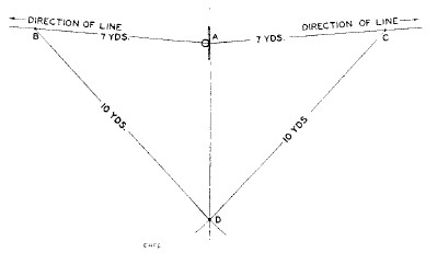 43. Setting 44. Comparison with the profile of the wall of a building will assist in the determination of correct pole-setting, and advantage should be taken of this facility in built-up areas, where pole alignment is of particular importance. Care should be taken to ensure that poles set on gradients are not inclined downhill. 45. Stayed poles 46. Direction of arms 47. Fig. 8 illustrates a simple method of locating .a view point (about 7yds. from the pole is usually convenient) from which, by sighting along the arms, their correct alignment relative to the direction of the line can be determined. With a measuring tape or length of sash line, measure from the armed side of the pole equal distances A-B and A-C along the direction of the line. Then locate the point required - D - equi-distant from B and C. This can be indicated by the mid-point of a 20yd. length of sash line, the ends of which are held at B and C. The distances shown in Fig. 8 are generally suitable for pole positions in straight sections of line and at terminal points. Some increase or reduction in these distances is desirable at appreciable angles in the line, depending on the position of the view-point, outside or inside the angle. NOTE:- Since the direction of angle and transverse stays and struts will usually be determined by sighting along the arms, it is important that the direction of the arms should be determined with especial care.