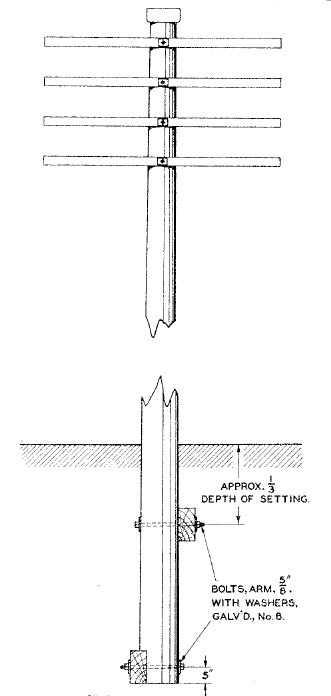 49. Filling in 50. Cylindrical holes 51. Reinstatement. 52. Numbering 53. Blocking 54. To obtain full advantage from blocking, the stayblocks should be placed in such a direction as to counteract most effectively the stresses on the pole. Thus, at terminal points, the blocks should be fitted at right-angles to the direction of the line, in accordance with C3301; at intermediate points, where blocks are required to counteract transverse stresses, they should be placed longitudinally, as shown in Fig. 9. Further, care should be taken to ensure correct shaping and adequate depth of the hole, and thorough consolidation of the soil. 55. Normally, two blocks should be fitted, one at about one-third of the depth of setting below the ground line and the other on the opposite side of the pole at the extreme butt. A medium or heavy stay-block, depending on the capacity of line and/or the character of the soil, should he used for the upper block. A light stayblock will generally suffice at the butt, owing to the greater earth resistance at the lower position. Where the stresses tending to deflect, the pole will be in one direction only, or are likely to predominate in one direction, the upper block should be fitted on the side to which such stresses will tend to pull the pole. 56. Except, in unsuitable soil, a single stayblock at about one-third of the depth of setting will generally provide all the additional support required for a light pole. 57. The pole should be cut at the butt to fit the lower block as shown in Fig. 9, but it should on no account be cut for the purpose of fitting the upper block. The cut surface should be liberally treated with " Creosote and Tar." The blocks should be secured to the pole by means of 5/8in. arm bolts, with "Washers, Galvanised, No. 8" in place of the ordinary arm-bolt washers ("Washers, Galvanised, No. 4").