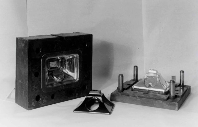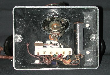 The terminal block for the cords is made of metal. In the prototype the handset cord is secured by means of a screw. The body being tapped for the thread of this as well as the thread for the fixing of the anti-side-tone coil, this process could not be continued when the body was produced in Bakelite. Due to the change in the material it was necessary to change the internal design. A metal ring was used to secure the cord and nuts to secure the coil, both of these items being inserted into the mould so that they become integral parts of the complete moulding.