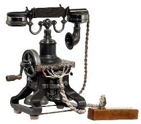 Telephone This was the world's first telephone with a one-piece handset, and probably more familiarly known as 'The Skeleton telephone', or, to the British collector as the 'No.16'. Almost all of the early prototypes are now housed in Museums. The handset model was dubbed the 'Ericsson Royal', as it was supplied initially to most of the Crowned Heads of Europe, and the National Telephone Company in England installed one in Windsor Castle at the command of Queen Victoria. The 'Mk.2' model for local installation in Sweden varied according to the system to which they were fitted, some having a lightening arrestor on the plinth instead of in the connection rosette; a smaller bell motor, and in some cases, smaller twin bell-gongs. By 1902, a 5th terminal had been added, and a twin-crank magneto fitted. A button was fitted on some models to open-circuit the ringer coils and short out the secondary winding of the inductor. The 6th edition of the catalogue (1911) was the last to show the swinging arm model. Almost from its first appearance, it was a worldwide success, and was later produced, under licence, in many countries, including the USA, South America, Great Britain and Europe. After 1911, the design remained basically unaltered throughout its long production run, except where minor modifications were made to accommodate local requirements. When the National Telephone Company relinquished its role and assets in 1912, the GPO designated the 'Skeleton' or 'Royal' as their 'Telephone No.16', being extremely conservative, and frowning upon unconventional names for their equipment. Records suggest that production ceased, at least in Europe, in the early 1930's, but many remained in service there until the late 1960's, and in Australia until ten years later. Some in the UK were fitted with dials during WW2, due to shortages of the GPO's 200/300 types. Most were black, but some, made in South America, or reconditioned in Sweden and Denmark to order, were enamelled in bright colours with silver or gold filigree. These are now rare. When the 'Skeleton' telephone first began to attract collectors in the USA in the mid-1950's, a black model in reasonable condition could be bought for $5. By the late 1960's, the price (USA) for a Portuguese manufactured model had risen to $40. Now, one in similar condition stocked by a dealer in the UK could cost between �400 and �800. Restoration of damaged specimens can be undertaken, with diligence, and some spares are still available via Collector's Clubs and Antique Telephone dealers The Ericsson 'Skeleton' or