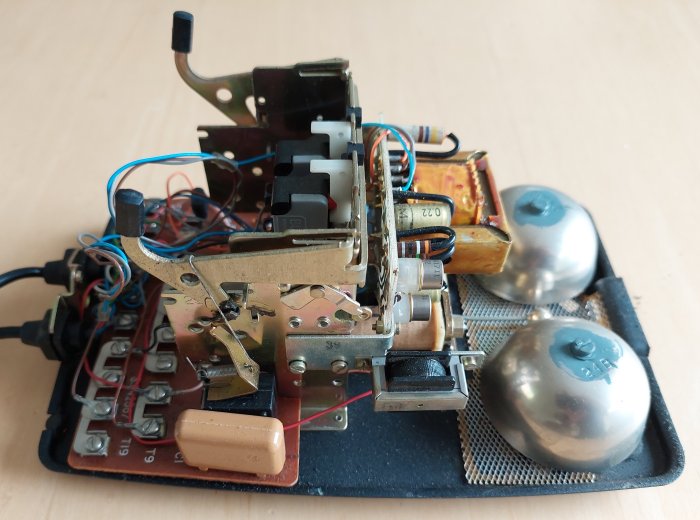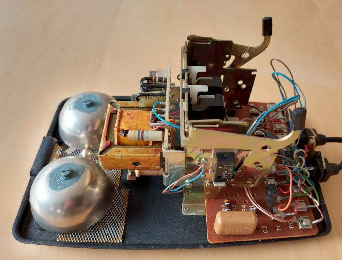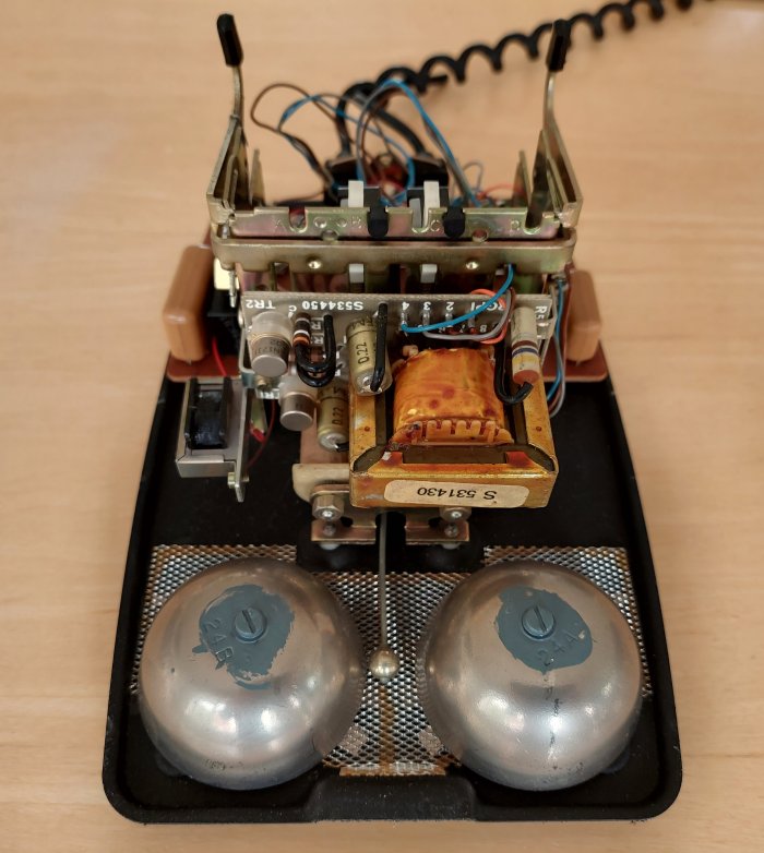 Table telephone which is a GPO Telephone No. 746, converted to a Local Battery telephone with two additional switches and a gravity hook operated switch fitted. It has an integral transistorised ringing generator, a local battery coil and an additional gravity switch operated springset. The mesh under the bell gongs is to stop insects and foreign objects entering the telephone. The case also has a foam strip, were the base meets the casing, to stop dust entering the telephone. Used by the Irish P&T as their Model 100M Mark 560 on Magneto circuits. Requires a 4.5v or 6v power supply / batteries to power the transmitter and operate the ringing generator. Ringing is only possible with the phone on hook. A single press button operates both the two installed switches (KR1 and KR2) at the same time. Click here for a diagram (dated 1978).