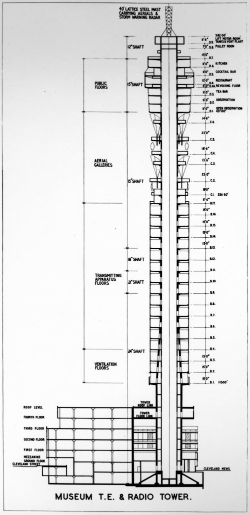 On the trunk of the tower, below the aerial galleries there are floors for ventilation and communication equipment. On the very top of the tower is a floor that houses the lift motors and water tanks. at the very top is a 40ft lattice aerial and a storm warning radar. At the bottom of the picture, to the left is the Museum Telephone Exchange which was bridged to the tower. This provided a secure access for staff and was also used to help stabilise the tower, to a small amount.