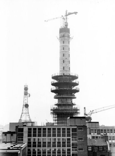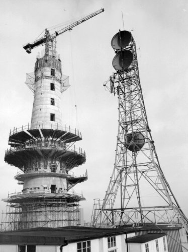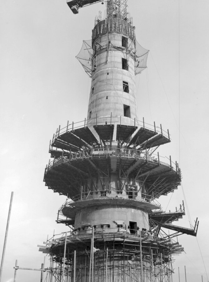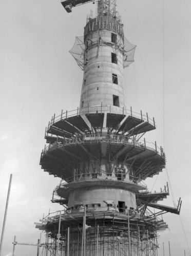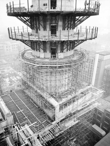 Construction of central shaft and technical floors, with existing lattice mast with dishes in foreground