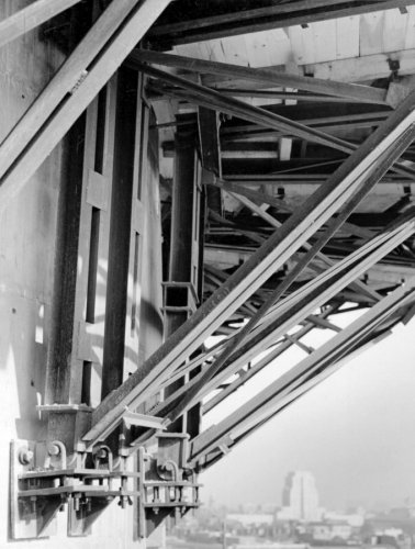 Workers constructing bracing struts near the top of the tower, including a view of the surrounding city in the background