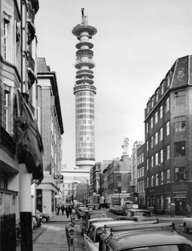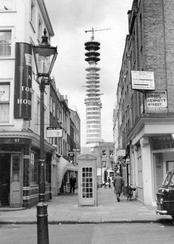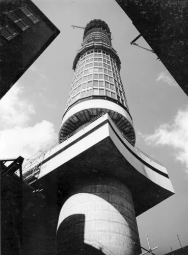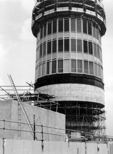 Showing the construction of bridge linking tower collar with neighbouring building, including workmen piping concrete