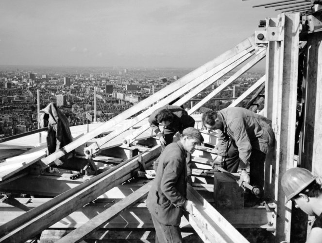 Workers constructing scaffolding near the top of the tower, including a view of the surrounding city in the background