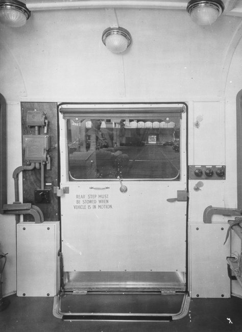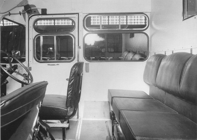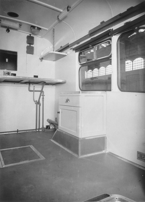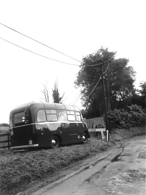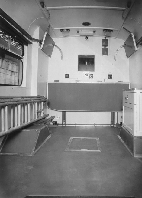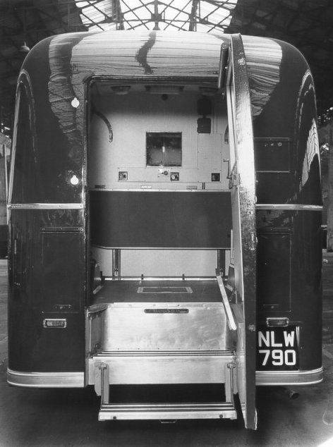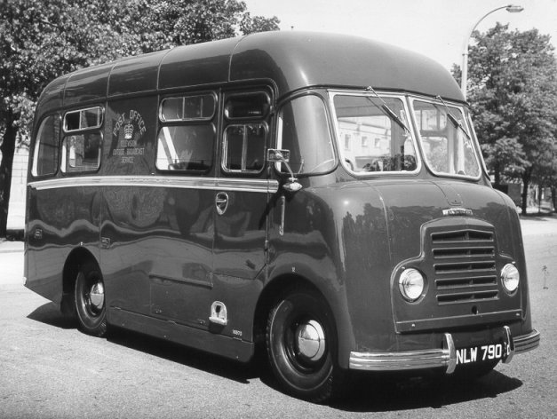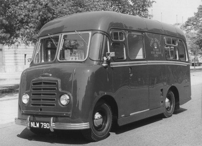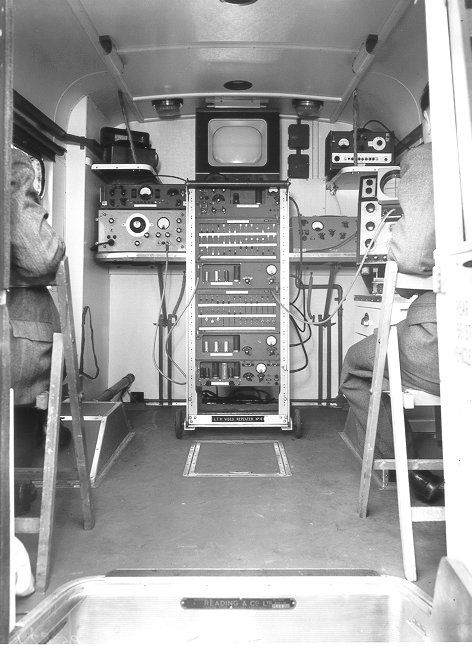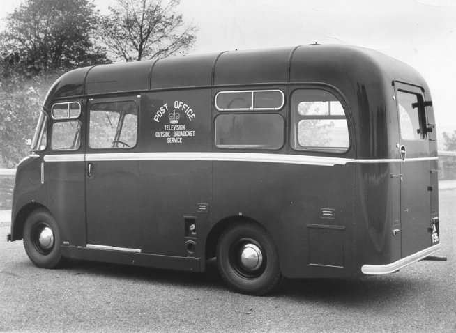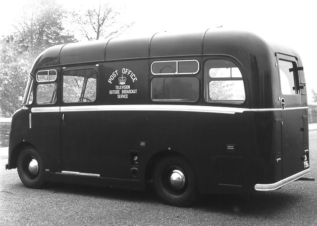 An extract from the The Post Office Electrical Engineers Journal A Vehicle for Television Outside Broadcast Service The new vehicle shown in the accompanying illustrations has been designed to accommodate equipment used by the Post Office in the provision of temporary vision links for B.B.C. television outside broadcasts. Two of the vehicles were in use during the Coronation broadcast; several more will shortly be going into service. In selecting a chassis for this vehicle great attention was paid to obtaining minimum vibration during running and ensuring the ability to withstand the wear and tear associated with manoeuvring the vehicle on and off broadcast sites, some of which may be difficult of access. The main feature of the chassis finally adopted is a suspension system using semi-elliptic springs operating in conjunction with double-acting piston-type hydraulic dampers. The power unit, a 4-cylinder side-valve engine rated at 16 h.p. is mounted on rubber to reduce vibration, and transmits power via a 4-speed gearbox. The body of the vehicle consists of a timber framework with outer panels of aluminium alloy and inner panels of plywood, the space between them being packed with a heat-insulating material. The plywood surface forming the interior of the vehicle is covered with P.V.C. fabric. In the rear compartment of the body, partitioned off from the driver's cabin, some 40 sq. ft. of floor space is available with 6 ft. headroom. Against the partition and extending the full width of the vehicle is a 2 ft. wide table on which the equipment is set out when the vehicle is on a broadcast site. When not in use the table can be folded back against the partition, leaving maximum clear floor space for stowing equipment in transit. Access to the rear compartment is obtained via a central glazed door at the rear of the vehicle. To facilitate wiring distribution for the television equipment, a channel fitted with hinged covers in 2-ft. sections extends from a terminal board at the rear of the vehicle to the table. The security and neatness of permanent wiring is thus obtained together with flexibility for wiring changes to meet various conditions. Flush-fitting cable entry flaps hinged at their upper edges are fitted on either side of the rear door. Sockets for carrying the aerial post are located on the outside of the vehicle at the rear. The aerial post is made up of two sections of standard duralumin pruning rod, a full set of rods being carried so that the height of the aerial may be increased if necessary. The lowest length of rod provides at its upper end a convenient anchorage for power cables. A 3-section aluminium extension ladder is carried in the vehicle secured by straps over the offside wheel arch. The cab accommodation affords comfortable seating for the driver and four passengers with locker space under the rear bench seat. Click for an article from the Post Office Telecommunications Journal 1955