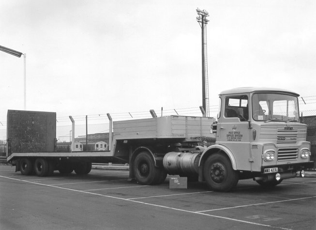 Guy Big J4T tractor unit with step frame machinery carrying trailer.